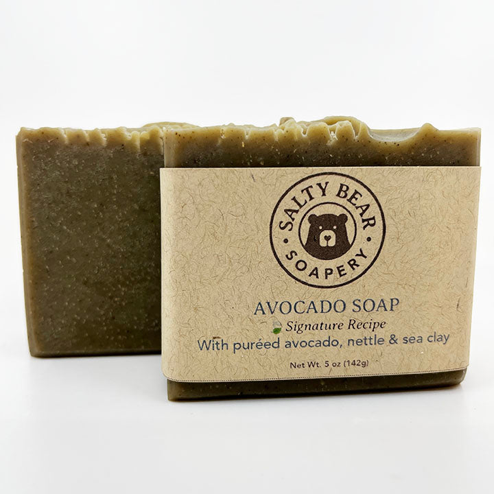 A longtime favorite and one of our original Signature Recipes, this naturally green bar is packed with creamy avocado, spirulina, nettle, and green clay for a gentle cleanse that feels like a treat for your skin. The lather is bubbly, rich, and moisturizing—great for daily use on face or body. Scented with a crisp, minty-citrus essential oil blend of pink grapefruit, patchouli, and peppermint.